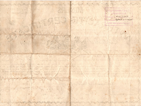 (Bottom) These photos depict the front and back of Harry Snyder's Miner Certificate for the Anthracite Coal District of the Susquehanna Coal Company (Lykens Division) where he worked. Note the stamp on the back when it was surrendered in April 1920, shortly after his life-threatening accident in the mines. Certificate provided by Jackie Martz.