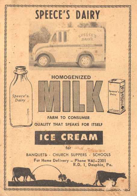 Two advertisements for Speece's Dairy in Halifax/Dauphin County advertisement booklets. Documents procured from HAHS Archives.